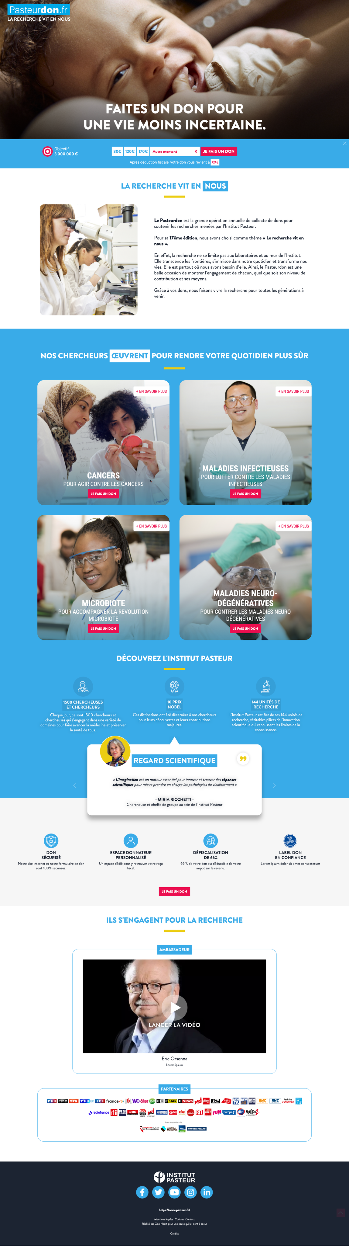 Le Pasteurdon est l’opération annuelle de mobilisation de l’Institut Pasteur qui a lieu chaque année au mois d’octobre. Une campagne de notoriété et de collecte multicanal pour découvrir les progrès réalisés sur le front de la recherche scientifique et biomédicale. En 2023, l’Institut Pasteur nous a fait confiance pour renouveler et amplifier cette 17e édition du Pasteurdon. L’enjeu étant également de continuer à moderniser l’image de l’association et amplifier l’impact digital de l’opération. Un dispositif 360 : mailing, cycle emailing, évènement de lancement, partenaires médias, activation réseaux sociaux, SEA, programmatique, influence, pure player, landing page, SMS…